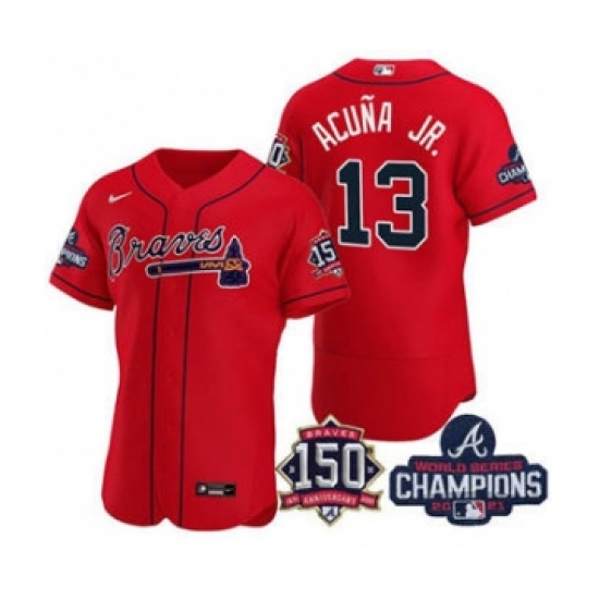 Men's Atlanta Braves #13 Ronald Acuna Jr. 2021 Red World Series Champions With 150th Anniversary Flex Base Stitched Jersey