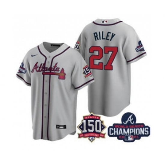 Men's Atlanta Braves #27 Austin Riley 2021 Grey World Series Champions With 150th Anniversary Patch Cool Base Stitched Jersey