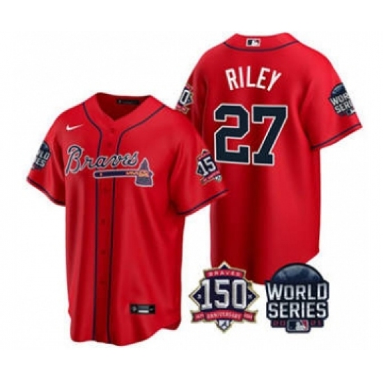 Men's Atlanta Braves #27 Austin Riley 2021 Red World Series With 150th Anniversary Patch Cool Base Stitched Jersey