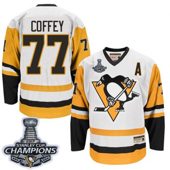 Men's CCM Pittsburgh Penguins #77 Paul Coffey Authentic White Throwback 2017 Stanley Cup Champions NHL Jersey