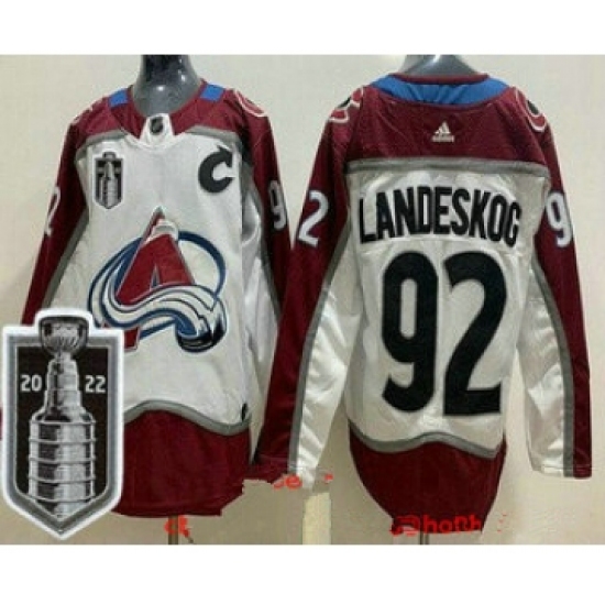 >Men's Colorado Avalanche #92 Gabriel Landeskog White 2022 Stanley Cup Stitched Jersey