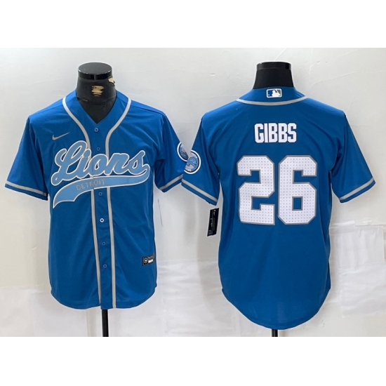 >Men's Detroit Lions #26 Jahmyr Gibbs Blue With Cool Base Stitched Baseball Jersey