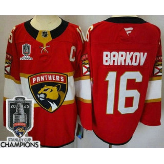 Men's Florida Panthers #16 Aleksander Barkov Red Home 2025 Stanley Cup Champions & C Stitched Hockey Jersey
