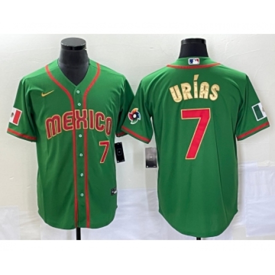 >Men's Mexico Baseball #7 Julio Urias Number 2023 Green Red Gold World Baseball Classic Stitched Jersey 2