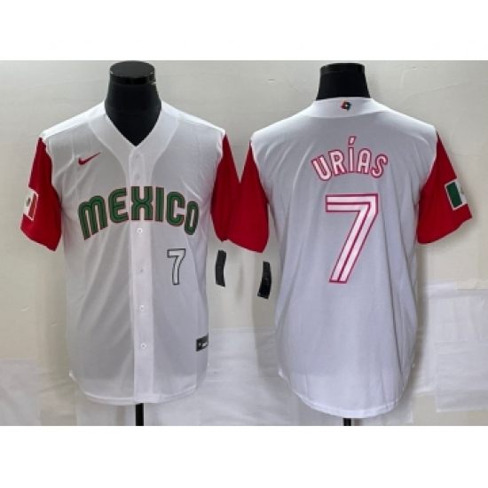 >Men's Mexico Baseball #7 Julio Urias Number 2023 White Red World Classic Stitched Jersey 41