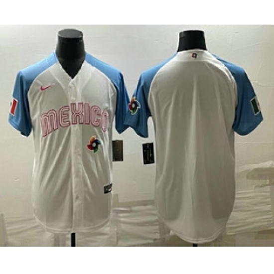 >Men's Mexico Baseball Blank 2023 White Blue World Classic Stitched Jersey