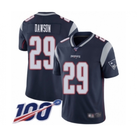 >Men's New England Patriots #29 Duke Dawson Navy Blue Team Color Vapor Untouchable Limited Player 100th Season Football Jersey