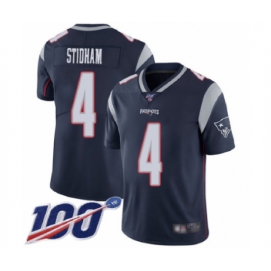 >Men's New England Patriots #4 Jarrett Stidham Navy Blue Team Color Vapor Untouchable Limited Player 100th Season Football Jersey