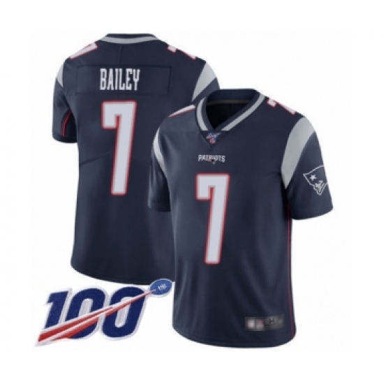 >Men's New England Patriots #7 Jake Bailey Navy Blue Team Color Vapor Untouchable Limited Player 100th Season Football Jersey