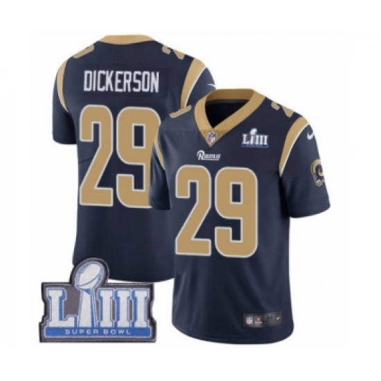 >Men's Nike Los Angeles Rams #29 Eric Dickerson Navy Blue Team Color Vapor Untouchable Limited Player Super Bowl LIII Bound NFL Jersey