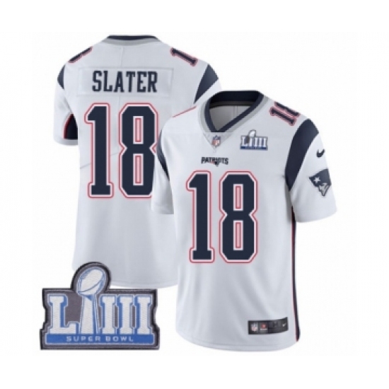 >Men's Nike New England Patriots #18 Matthew Slater White Vapor Untouchable Limited Player Super Bowl LIII Bound NFL Jersey