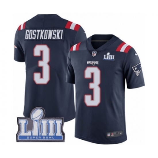 >Men's Nike New England Patriots #3 Stephen Gostkowski Limited Navy Blue Rush Vapor Untouchable Super Bowl LIII Bound NFL Jersey