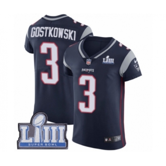 >Men's Nike New England Patriots #3 Stephen Gostkowski Navy Blue Team Color Vapor Untouchable Elite Player Super Bowl LIII Bound NFL Jersey