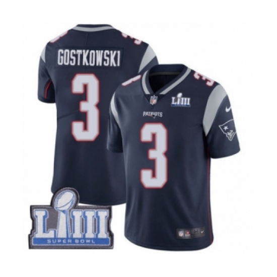 >Men's Nike New England Patriots #3 Stephen Gostkowski Navy Blue Team Color Vapor Untouchable Limited Player Super Bowl LIII Bound NFL Jersey