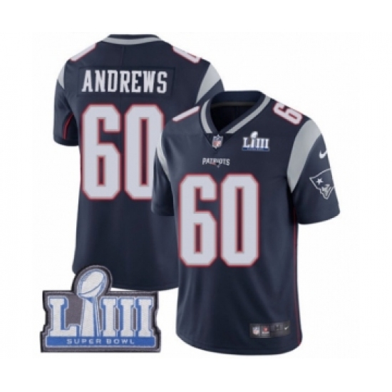 >Men's Nike New England Patriots #60 David Andrews Navy Blue Team Color Vapor Untouchable Limited Player Super Bowl LIII Bound NFL Jersey