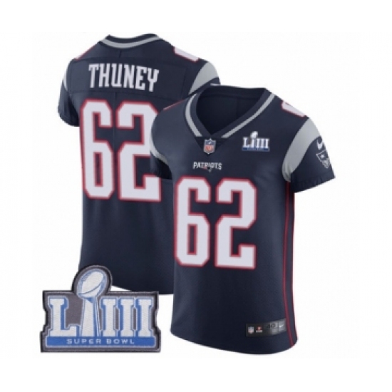 Men's Nike New England Patriots #62 Joe Thuney Navy Blue Team Color Vapor Untouchable Elite Player Super Bowl LIII Bound NFL Jersey