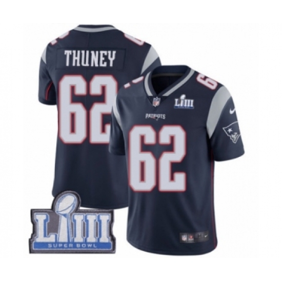 Men's Nike New England Patriots #62 Joe Thuney Navy Blue Team Color Vapor Untouchable Limited Player Super Bowl LIII Bound NFL Jersey