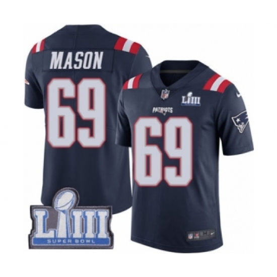 >Men's Nike New England Patriots #69 Shaq Mason Limited Navy Blue Rush Vapor Untouchable Super Bowl LIII Bound NFL Jersey