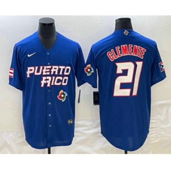 Men's Puerto Rico Baseball #21 Roberto Clemente 2023 Blue World Classic Stitched Jersey