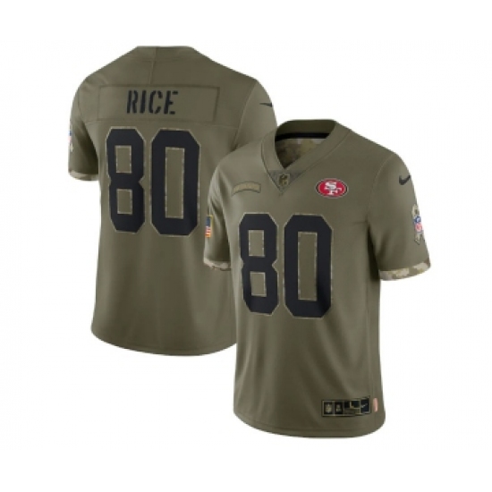 >Men's San Francisco 49ers #80 Jerry Rice 2022 Olive Salute To Service Limited Stitched Jersey