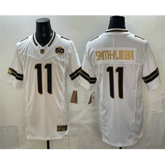 >Men's Seattle Seahawks #11 Jaxon Smith-Njigba White Gold 2025 FUSE 50th Season Limited Stitched Jersey