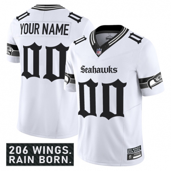 >Men's Seattle Seahawks Active Player Custom White 2025 F.U.S.E. 'Gothic Rain City Shadows Edition' Vapor Limited Stitched Jersey