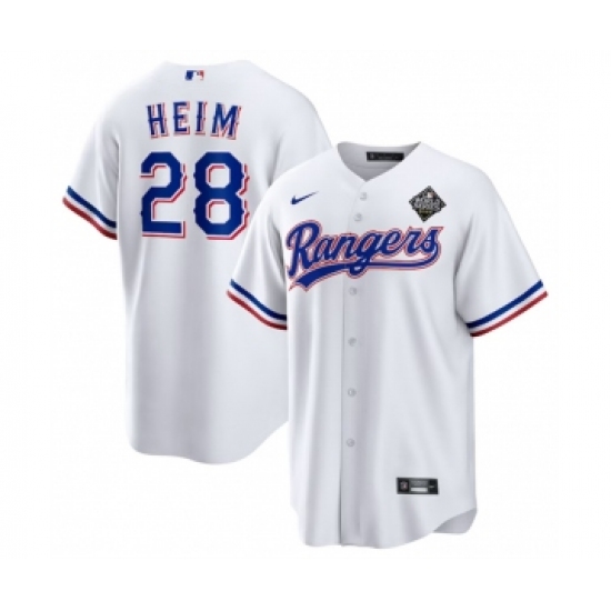 Men's Texas Rangers #28 Jonah Heim 2023 White World Series Stitched Baseball Jersey