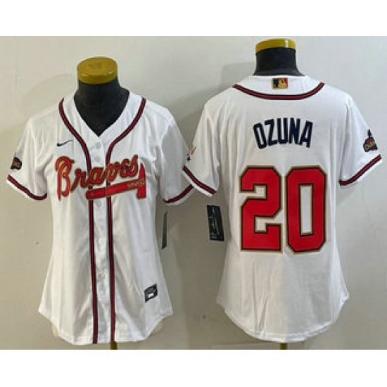 >Women's Atlanta Braves #20 Marcell Ozuna White Gold World Series Champions Cool Base Stitched Jersey
