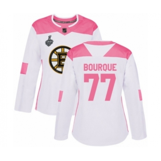 >Women's Boston Bruins #77 Ray Bourque Authentic White Pink Fashion 2019 Stanley Cup Final Bound Hockey Jersey