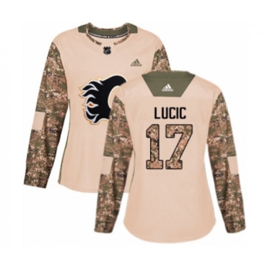 >Women's Calgary Flames #17 Milan Lucic Authentic Camo Veterans Day Practice Hockey Jersey
