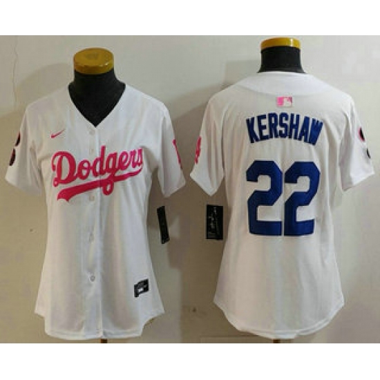 >Women's Los Angeles Dodgers #22 Clayton Kershaw White Pink With Limited Stitched Jersey