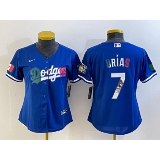 >Women's Los Angeles Dodgers #7 Julio Urias Blue 2020 World Series Cool Base Nike Jersey