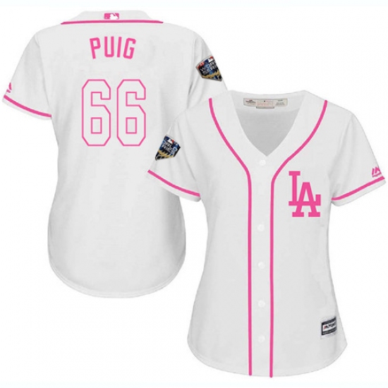 >Women's Majestic Los Angeles Dodgers #66 Yasiel Puig Authentic White Fashion Cool Base 2018 World Series MLB Jersey