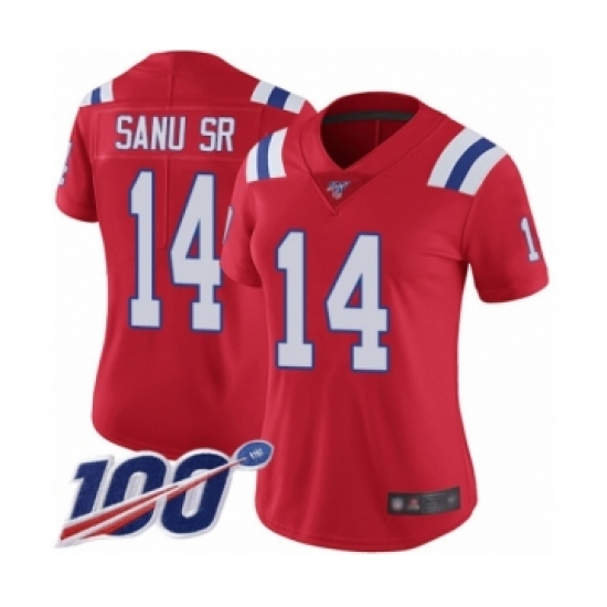>Women's New England Patriots #14 Mohamed Sanu Sr Red Alternate Vapor Untouchable Limited Player 100th Season Football Jersey