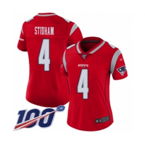 >Women's New England Patriots #4 Jarrett Stidham Limited Red Inverted Legend 100th Season Football Jersey