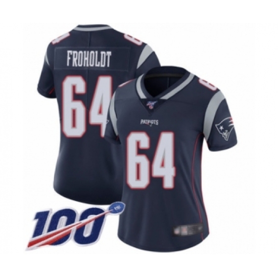 >Women's New England Patriots #64 Hjalte Froholdt Navy Blue Team Color Vapor Untouchable Limited Player 100th Season Football Jersey