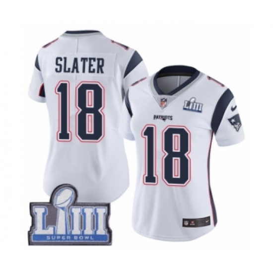 >Women's Nike New England Patriots #18 Matthew Slater White Vapor Untouchable Limited Player Super Bowl LIII Bound NFL Jersey