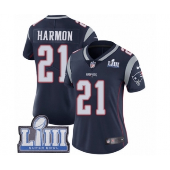 >Women's Nike New England Patriots #21 Duron Harmon Navy Blue Team Color Vapor Untouchable Limited Player Super Bowl LIII Bound NFL Jersey