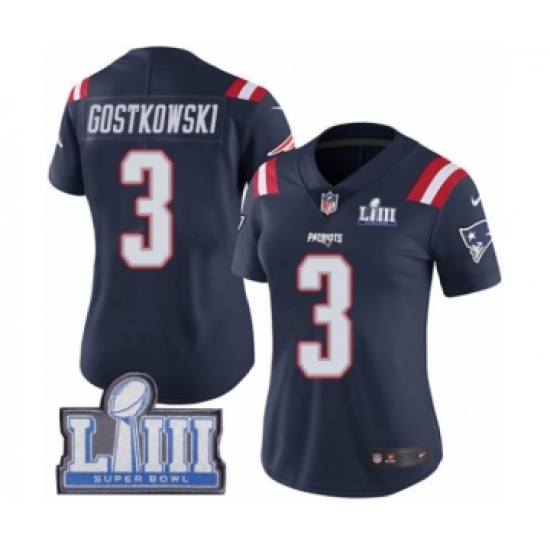 >Women's Nike New England Patriots #3 Stephen Gostkowski Limited Navy Blue Rush Vapor Untouchable Super Bowl LIII Bound NFL Jersey