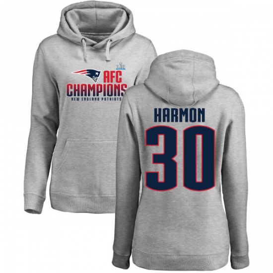 >Women's Nike New England Patriots #30 Duron Harmon Heather Gray 2017 AFC Champions Pullover Hoodie
