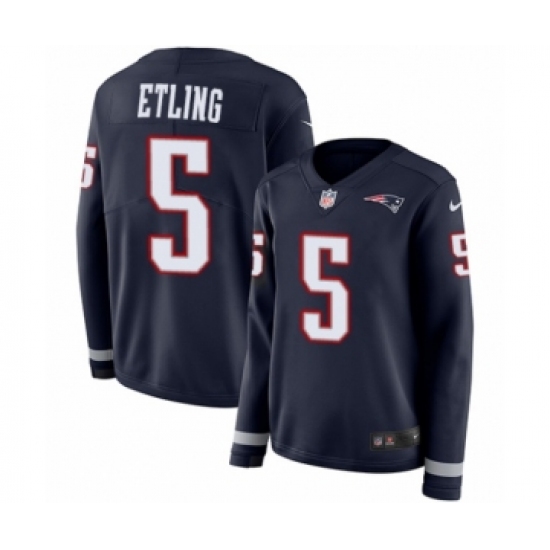 >Women's Nike New England Patriots #5 Danny Etling Limited Navy Blue Therma Long Sleeve NFL Jersey