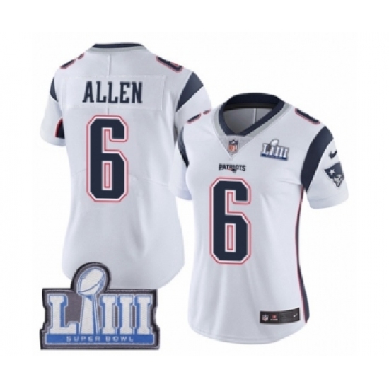 >Women's Nike New England Patriots #6 Ryan Allen White Vapor Untouchable Limited Player Super Bowl LIII Bound NFL Jersey
