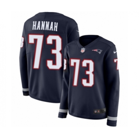 >Women's Nike New England Patriots #73 John Hannah Limited Navy Blue Therma Long Sleeve NFL Jersey