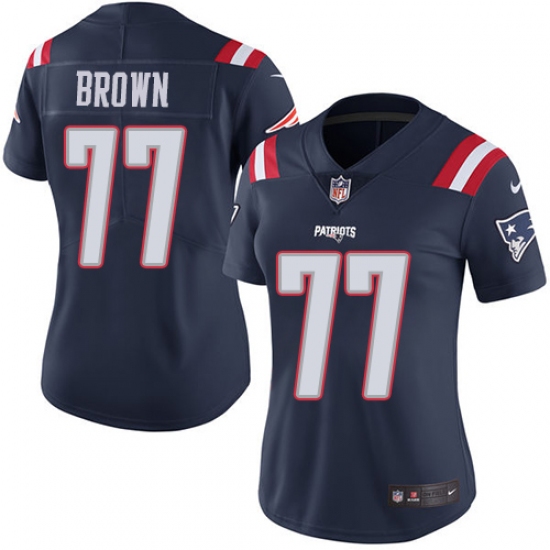 >Women's Nike New England Patriots #77 Trent Brown Limited Navy Blue Rush Vapor Untouchable NFL Jersey