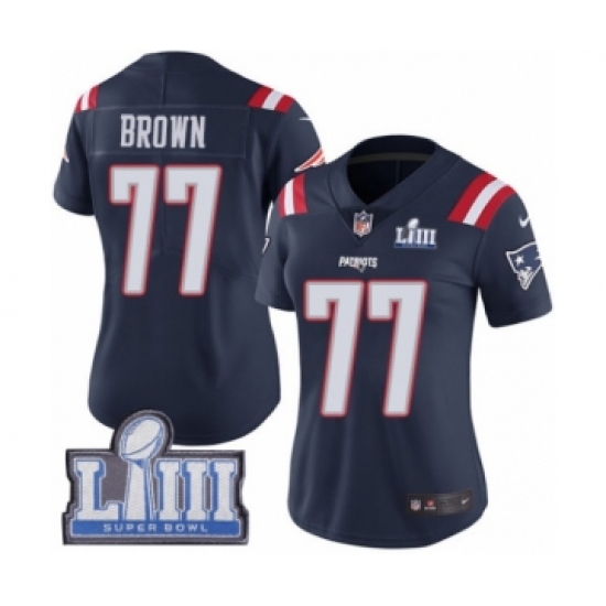 >Women's Nike New England Patriots #77 Trent Brown Limited Navy Blue Rush Vapor Untouchable Super Bowl LIII Bound NFL Jersey