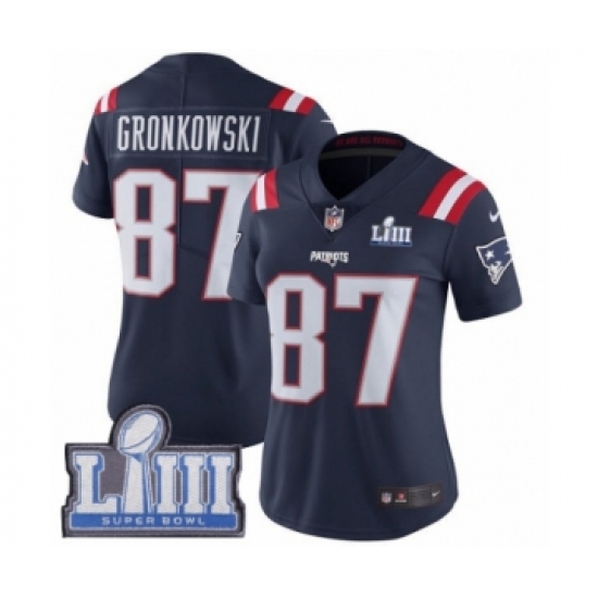 >Women's Nike New England Patriots #87 Rob Gronkowski Limited Navy Blue Rush Vapor Untouchable Super Bowl LIII Bound NFL Jersey