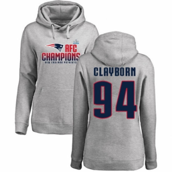 >Women's Nike New England Patriots #94 Adrian Clayborn Heather Gray 2017 AFC Champions Pullover Hoodie