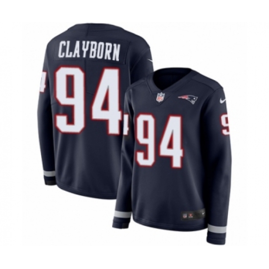 >Women's Nike New England Patriots #94 Adrian Clayborn Limited Navy Blue Therma Long Sleeve NFL Jersey