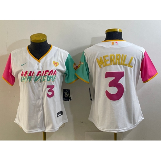 >Women's San Diego Padres #3 Jackson Merrill Number White Heart 2024 City Connect Cool Base Stitched Jersey
