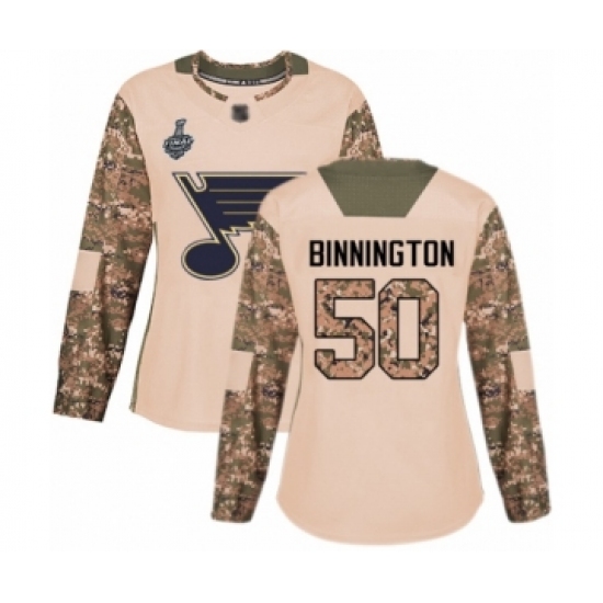 >Women's St. Louis Blues #50 Jordan Binnington Authentic Camo Veterans Day Practice 2019 Stanley Cup Final Bound Hockey Jersey